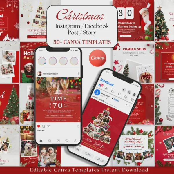 50 Editable Christmas Canva Templates – Posts & Stories for Social Media (Digital Download)